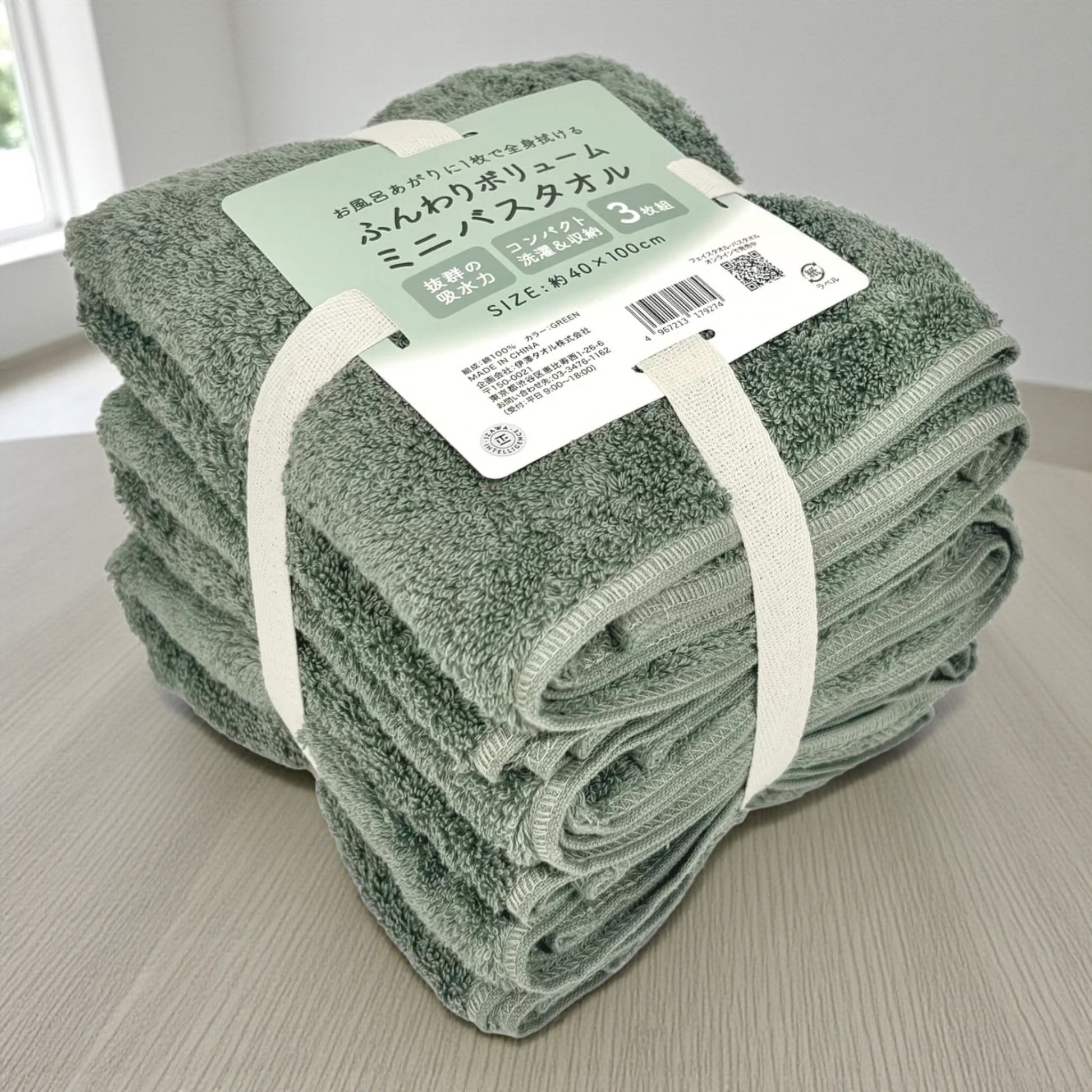 ふんわりボリューム ミニバスタオル 40cm×100cm 3枚組 カラー グリーン (ダークグレー グリーン ピンク)
