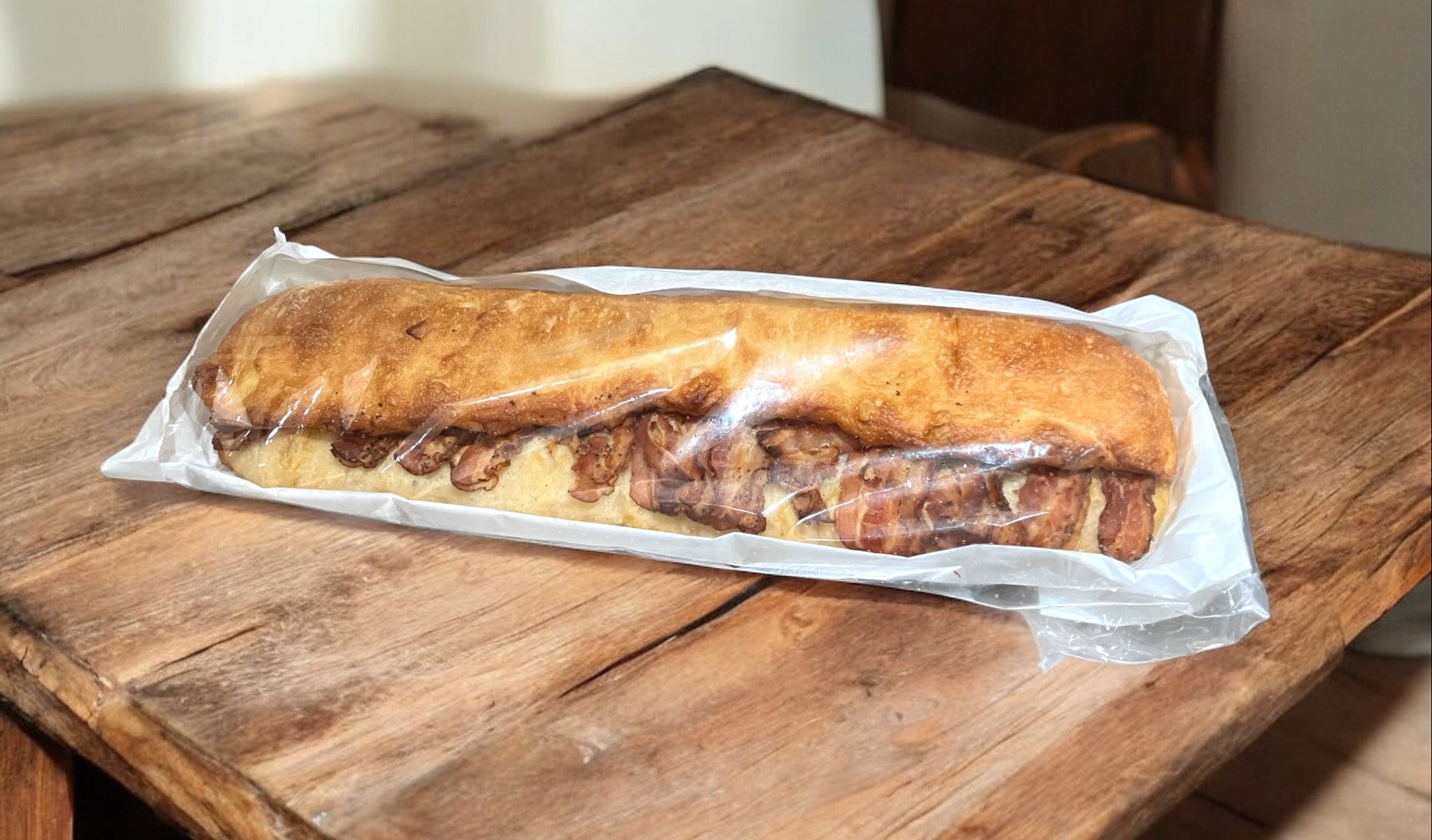 チャバタ風の生地にスライスベーコンをたっぷり巻き込み、ブラックペッパーで大人の味わいに仕上げた惣菜パンです。外はカリッと香ばしく、中はしっとりモチモチの食感が楽しめます。ベーコンの塩味と豊かな風味が口いっぱいに広がり、噛むほどに旨味が深まる一品です。中にチーズを入れてトーストしたりレタスを挟んだり、多彩なアレンジに合うのも魅力♪長さ約40㎝ 1本そのままの販売です。※別売りで1/4カットの小分け販売もあります。