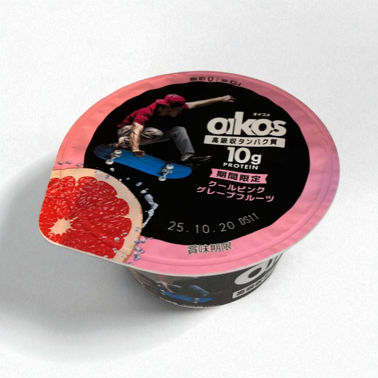 オイコス ピンクグレープフルーツは「たんぱく質は吸収しないと意味がない」というメーカーさんの想いが詰まったオイコス シリーズのヨーグルト。 ピンクグレープフルーツ味。ラベルレス。